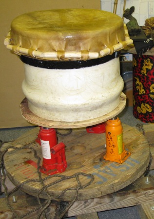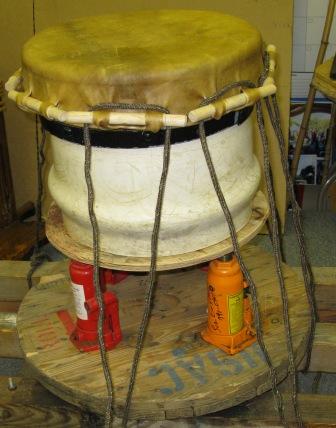 Left; the hide has been placed on the drum